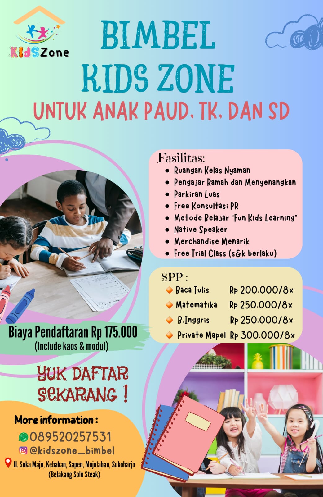 Buat ayah/bunda yang memiliki putra putri SD (kelas 1-6) kak, TK dan PAUD yuk gabung bersama kita di bimbingan belajar kidszone. Fun learn menjadi metode dasar kita dalam mendidik putra putri ayah/bunda, jadi ga ada kata si anak jenuh dan pastinya pulang riang gembira dengan ilmu yg terserap dengan maksimal oleh anak. Cocok nih buat ayah/bunda yang pengin anaknya cekatan baca tulis, jago dan capciscus bahasa inggris atau brilian di matematika.