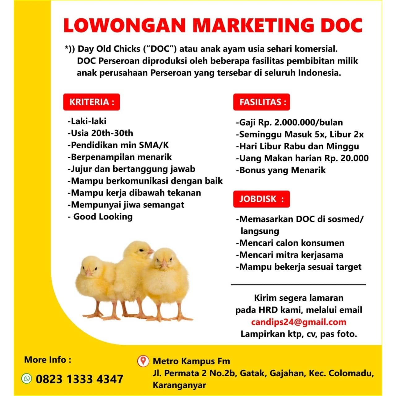 Kirim segera lamaran pada HRD kami, melalui email candips24@gmail.com