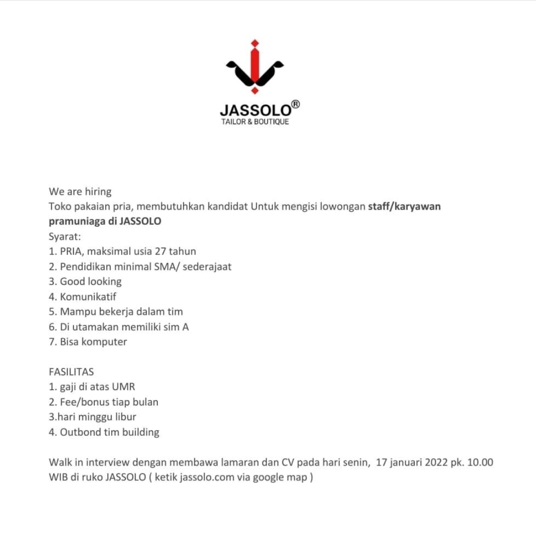 Lowongan Kerja Pramuniaga di Jas Solo