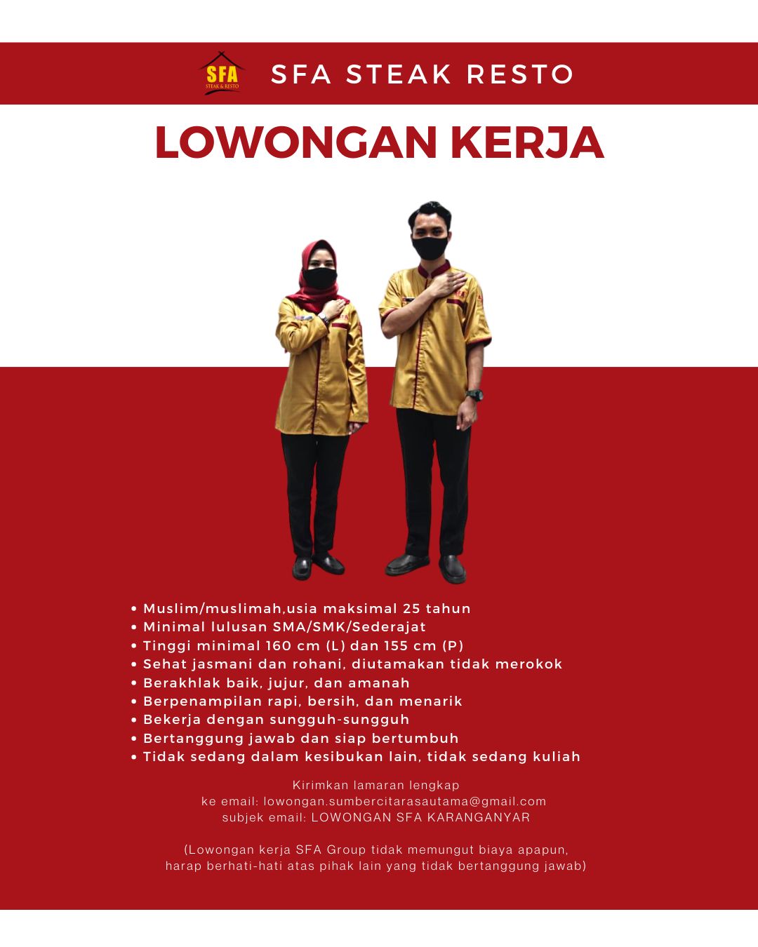 Buat kamu yang masih bingung cari kerja @sfasteak Karanganyar baru ada lowongan lho! Yuk langsung lamar aja dan bergabung dengan team hebat SFA!