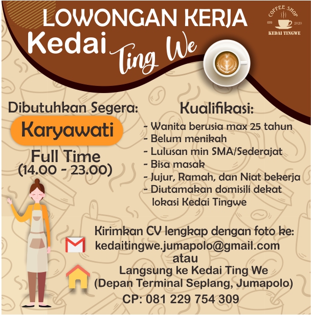 – Kirimkan lamaran ke outlet Kedai Ting We atau melalui email kedaitingwe.jumapolo@gmail.com