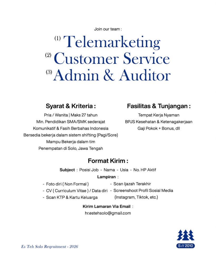 Kirim Berkas CV ke : hr.estehsolo@gmail.com