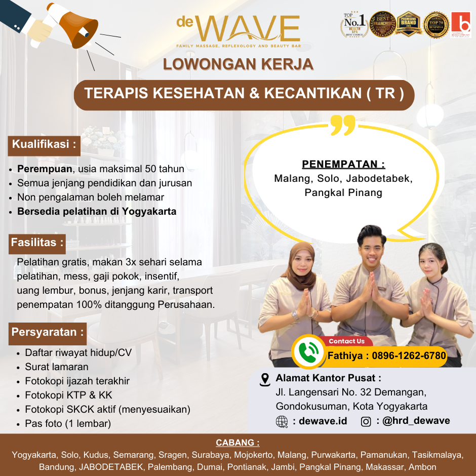 Hallo jobseeker, Devawe Family Massage, Reflexology & Beauty Bar saat ini membuka lowongan besar-besaran untuk posisi Terapis dan Kepala Outlet penempatan di SOLO, MALANG, Jabodetabek dan Pangkal Pinang. Kami saat ini sudah mempunyai 50+ cabang tersebar di seluruh indonesia