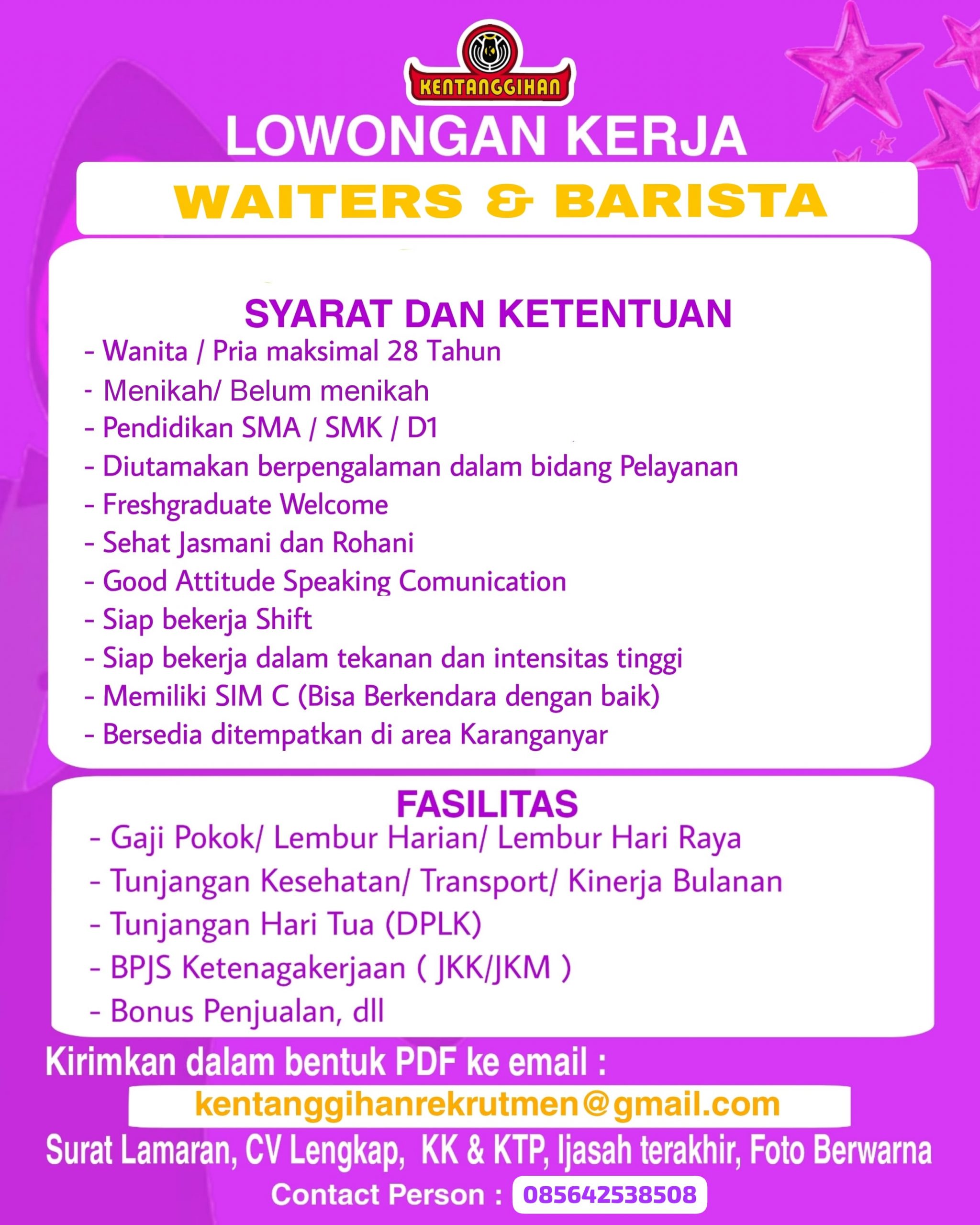 Kirim cv dan lamaran ke email kentanggihanrekrutmen@gmail.com